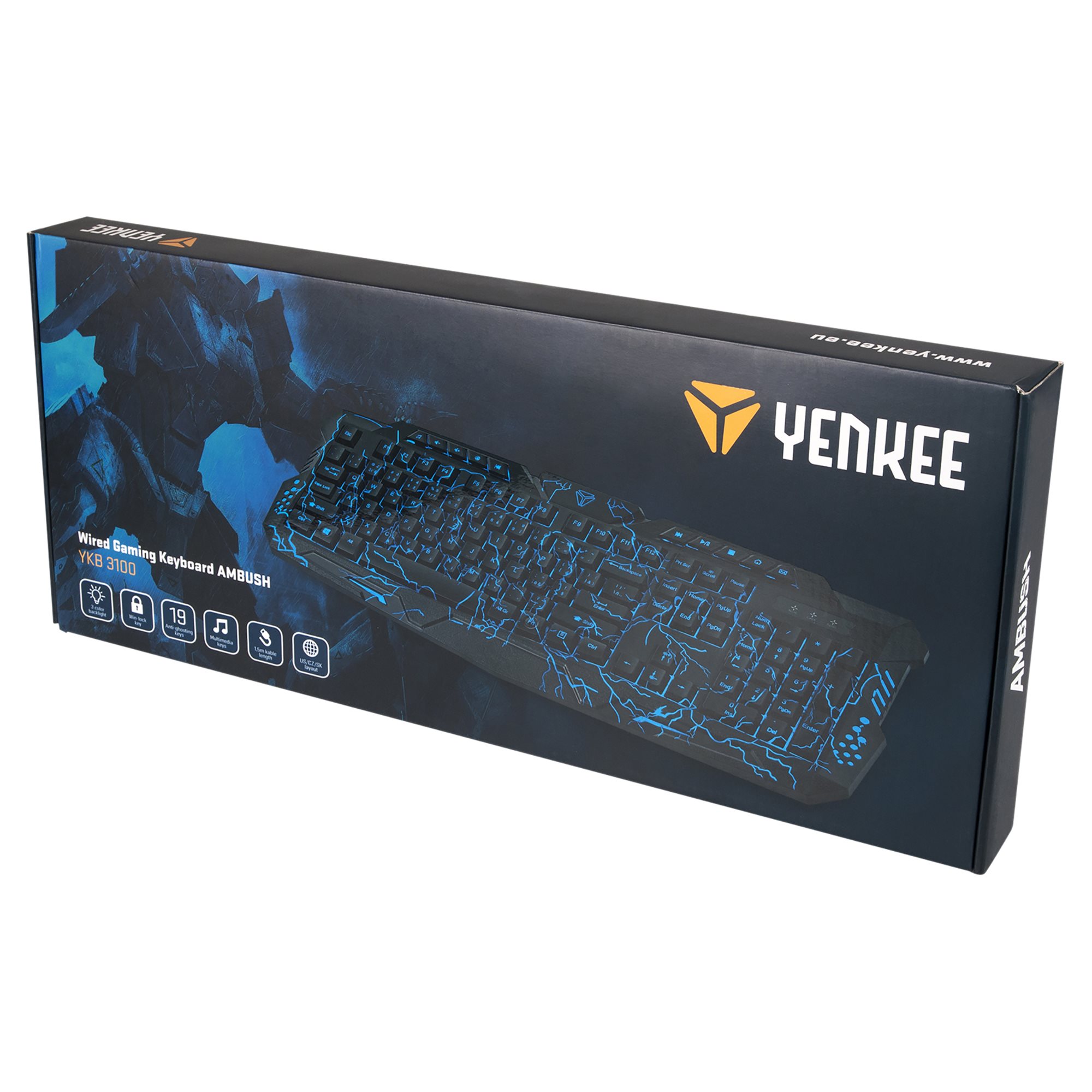 Egy vezetékes gamer billentyűzet, mely meglepi lenyűgöző háttérvilágítású kialakításával. Az AMBUSH billentyűzet kényelmes játékot biztosít, és háromféle alapszínben választhat háttérvilágítást. Módosíthatja a fényerőt vagy beállíthat háromszínű vagy egyszínű körmegvilágítást.