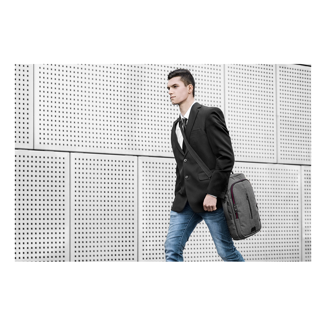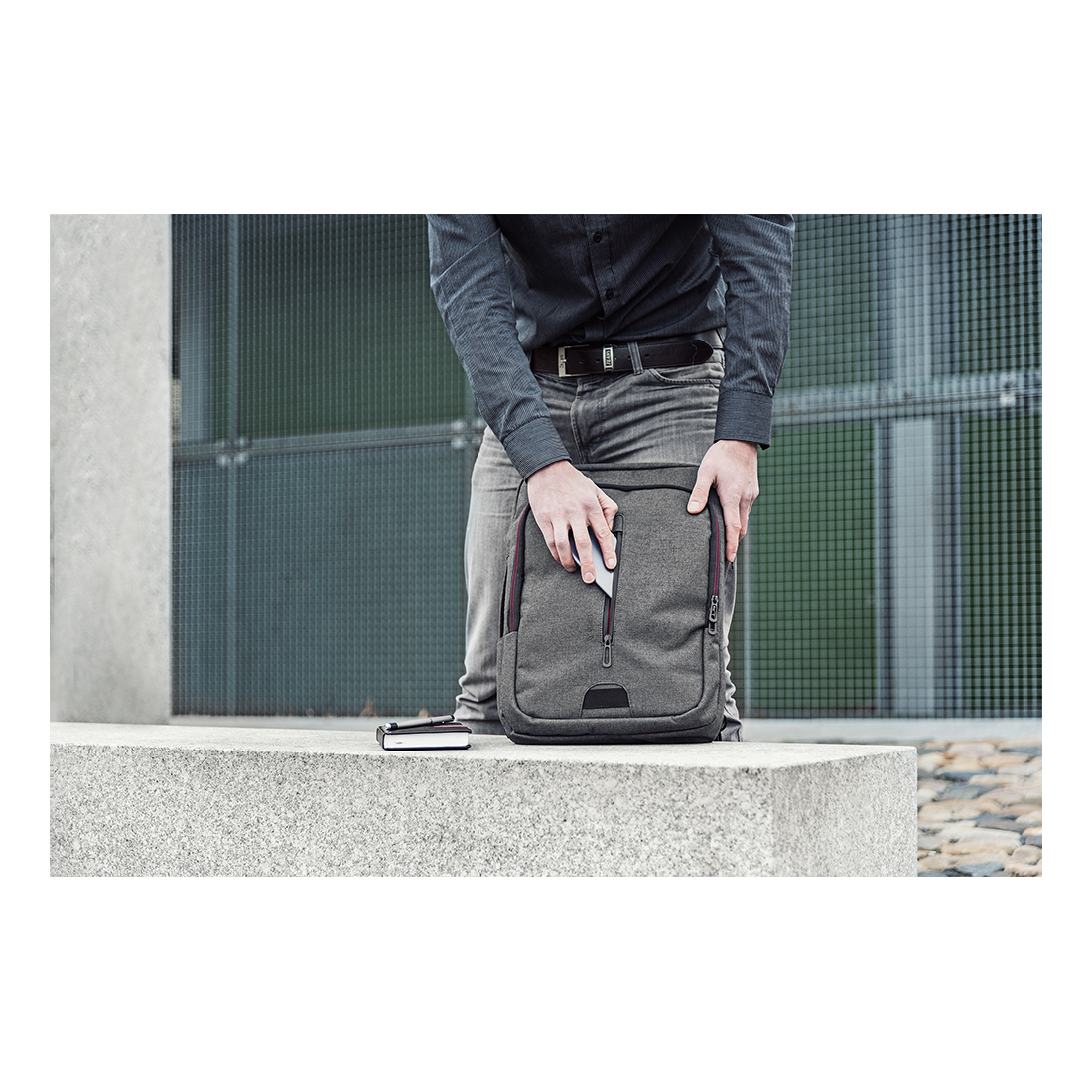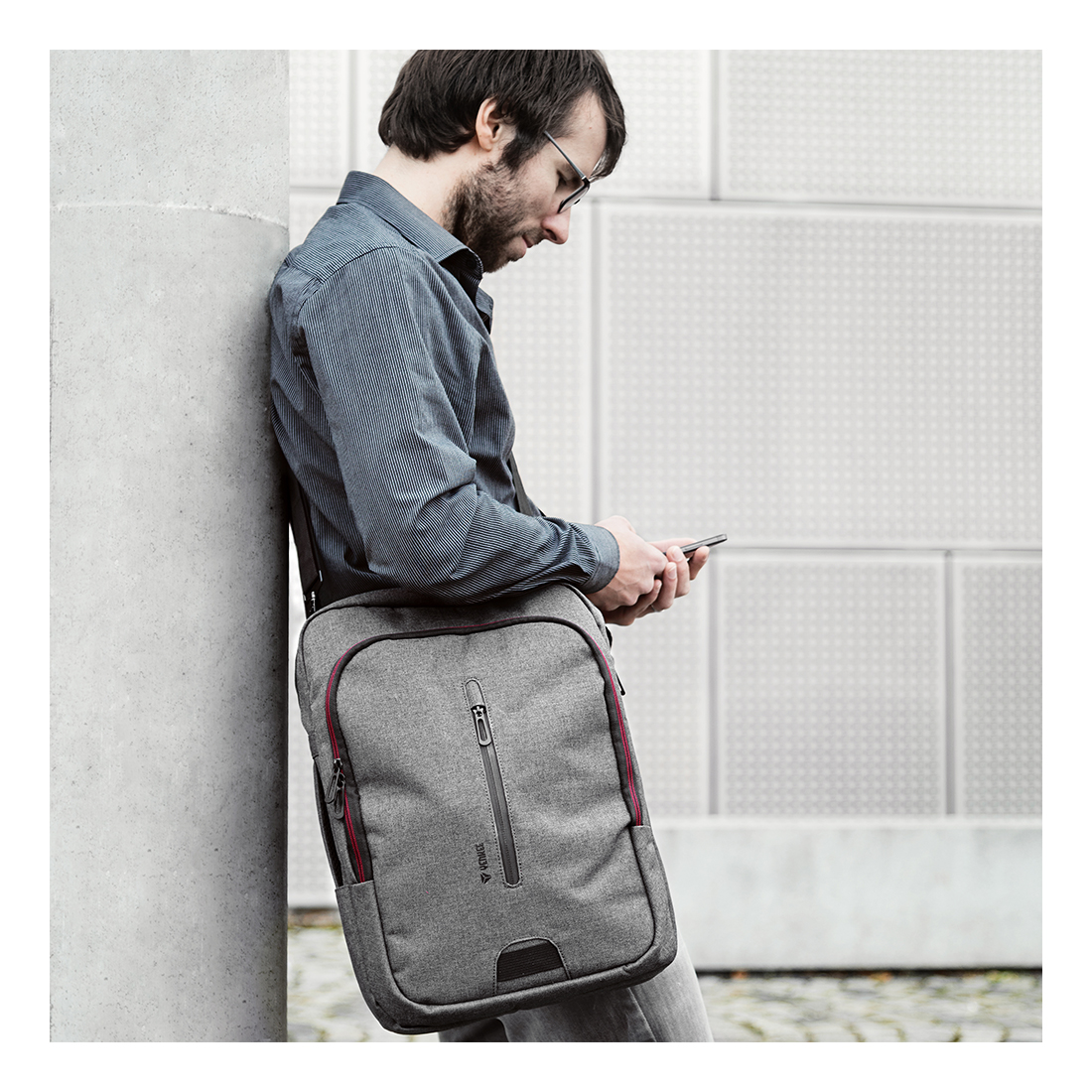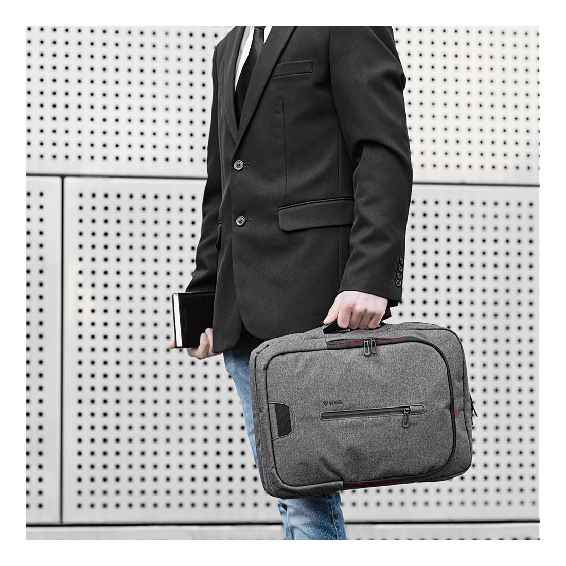 A táskát a könnyebb közlekedés érdekében hozzá lehet erősíteni a kerekes bőrönd fogantyújához. A két elülső zseb alkalmas értékek, dokumentumok és gyakran használt apró tárgyak tárolására.