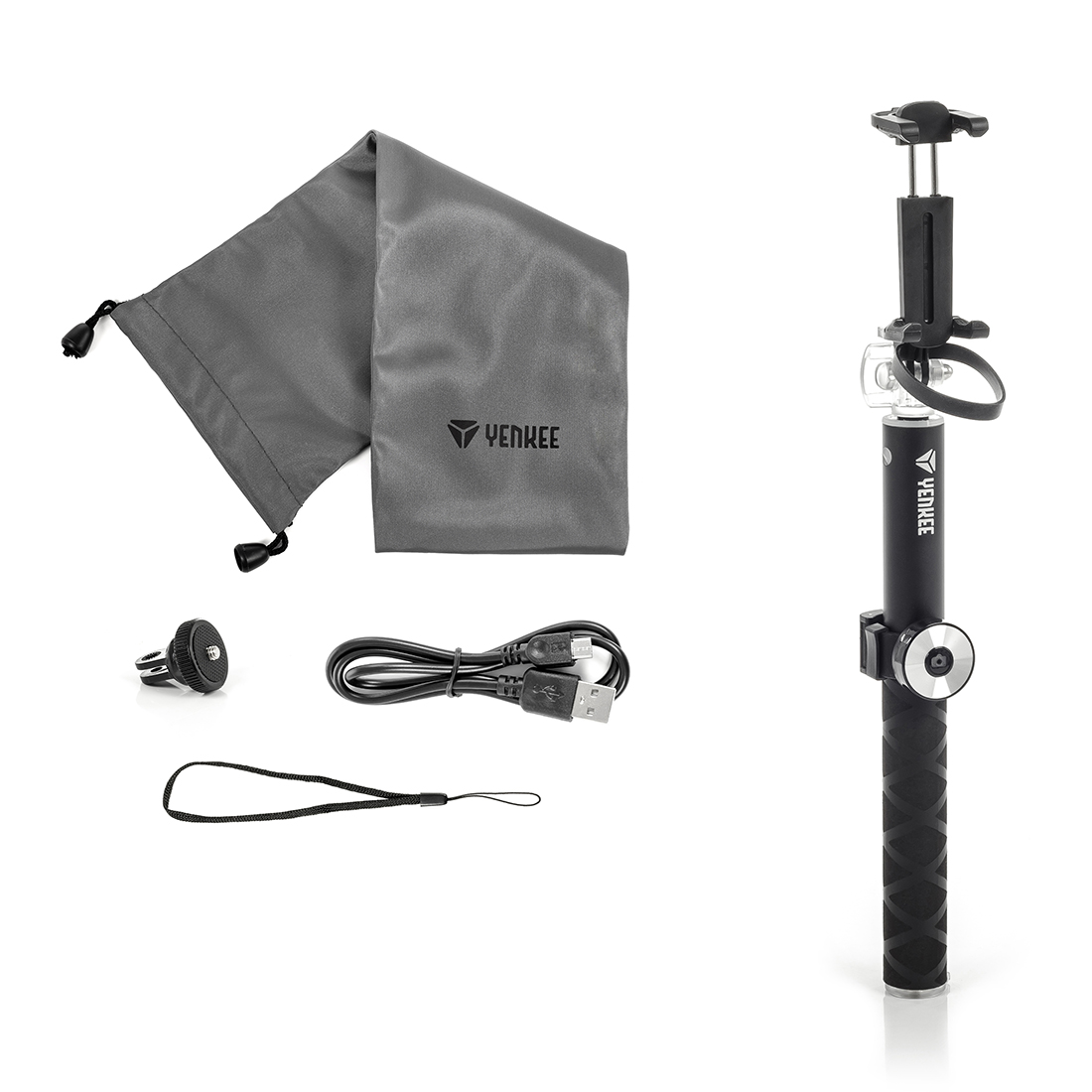 A mellékelt gumiszalag a csuklóján megakadályozza, hogy véletlenül kiengedje a botot a kezéből. A vízhatlan anyagból készült praktikus szállítózacskó szelfikészletét nedves időben is szárazon tartja. 4" - 5,5" méretű okostelefonokhoz.