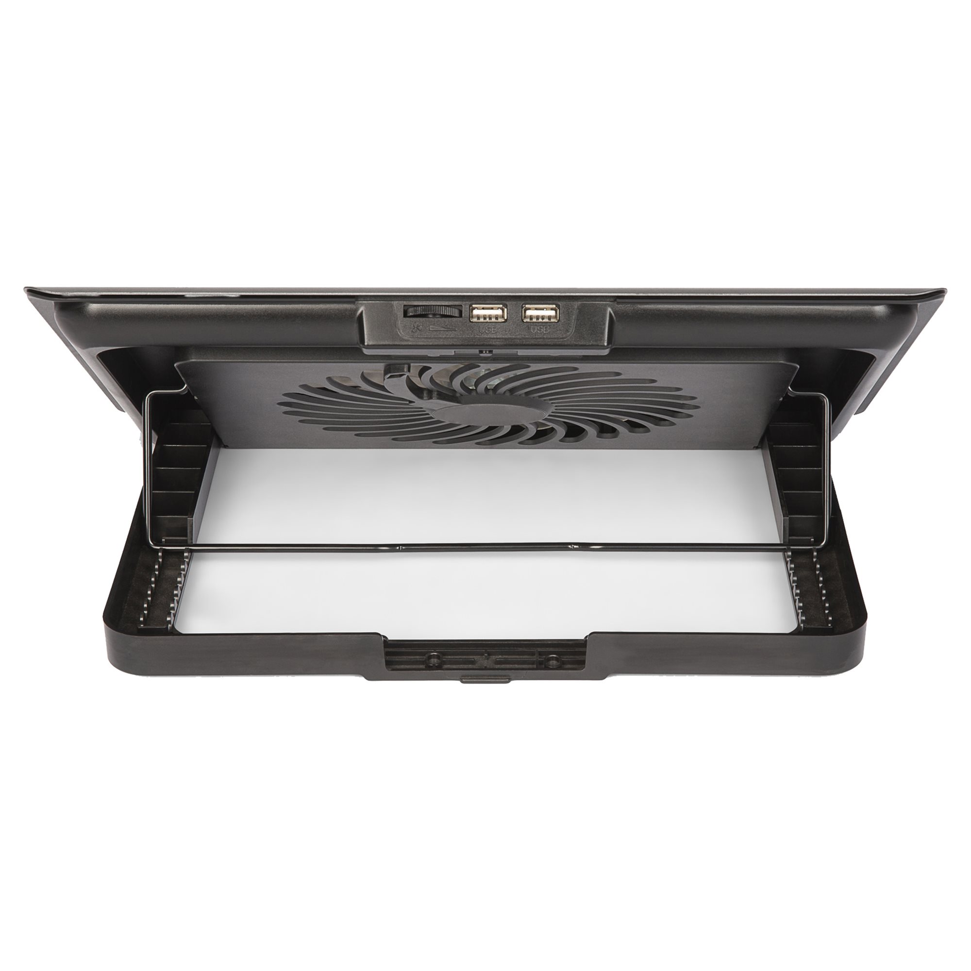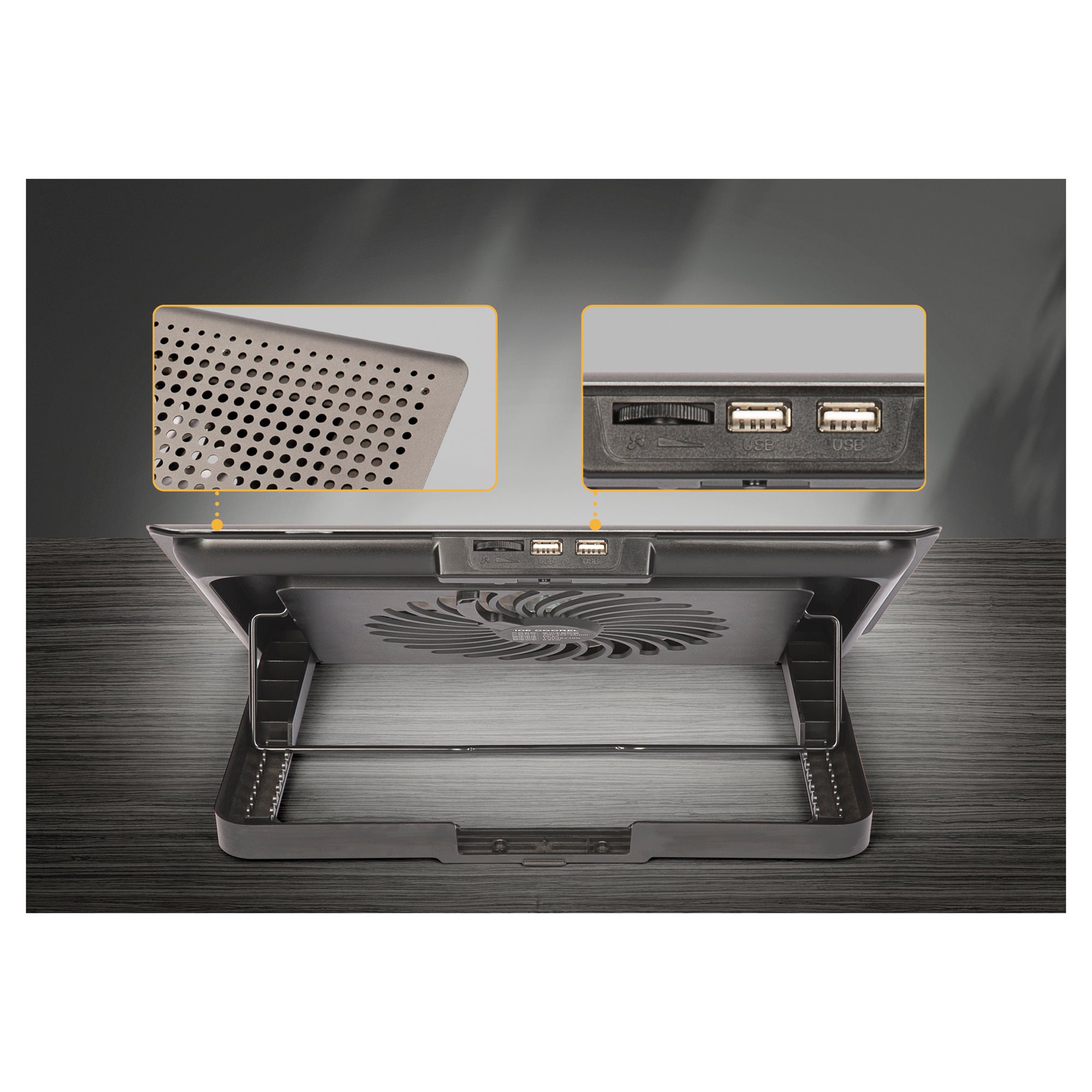 A hűtőalátét egyszerűen csatlakoztatható az eszközhöz egy USB A porton keresztül. Az alátét hűtési teljesítménye 1-4 ventilátor-fordulatszámra állítható alacsony hűtési fokozatra, míg 5-8 fordulatszámot választhatsz magas hűtési igény esetén. A maximális szellőzési sebesség 650 fordulat/perc, így a laptop mindig optimálisan hűtött marad. Ezen kívül a hűtőalátét lehetővé teszi a képernyő szögének beállítását is, hogy biztosítsa a kényelmes munkavégzést és a helyes testtartást.