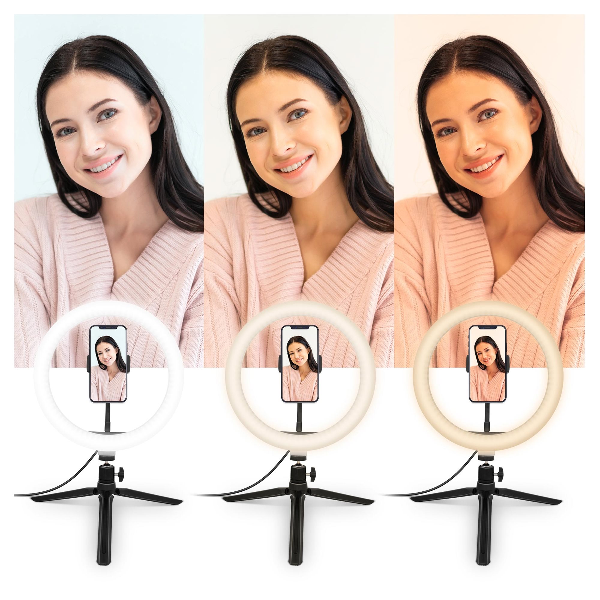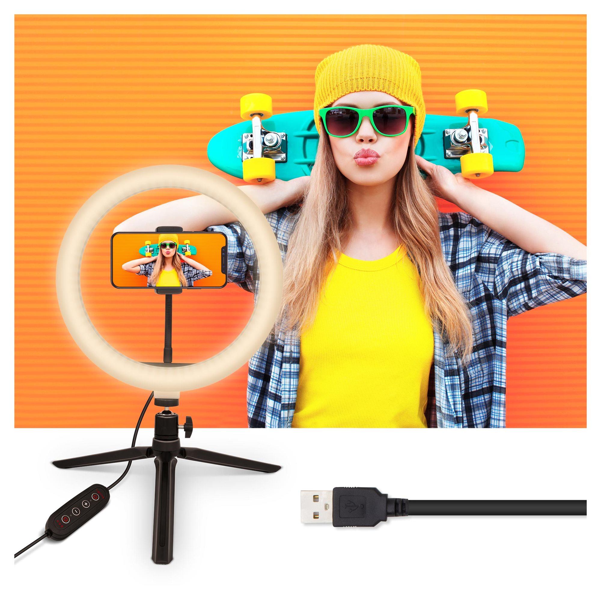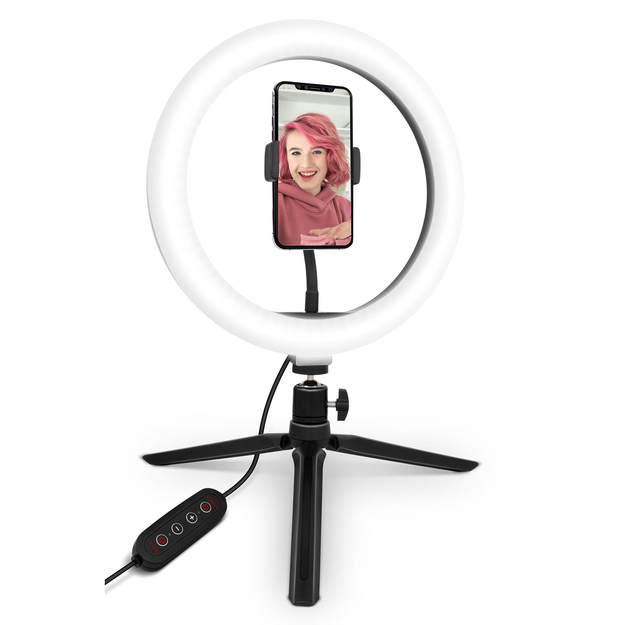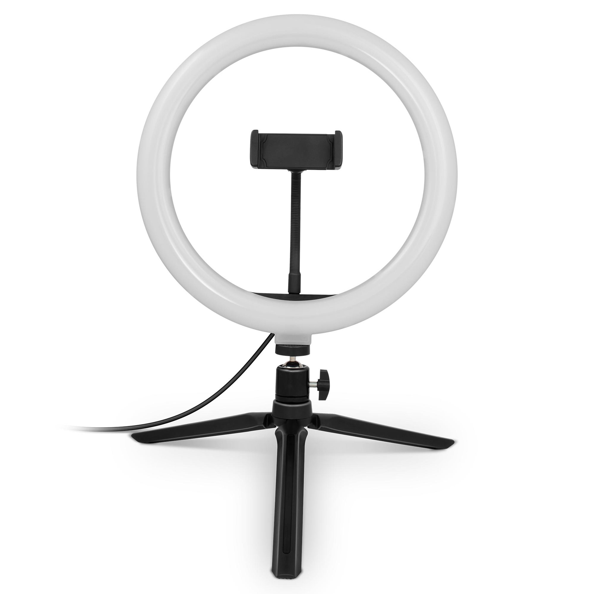A gyűrű része a 10"-os kör alakú LED-es lámpa mellett egy praktikus állvány is, amely egyedileg pozícionálható és 360°-ban forgatható. Ez egy dolgot jelent számodra; teljes szabadságot kapsz a helyszín kialakításában. Ha maximum 80 mm széles telefonnal rendelkezel, akkor most megtaláltad, amit kerestél. Mindössze 10 W-ra van szüksége a tápellátáshoz, amit a tápkábel végén található USB A csatlakozón keresztül kap meg, amelyhez egy praktikus vezérlőpanel is tartozik.