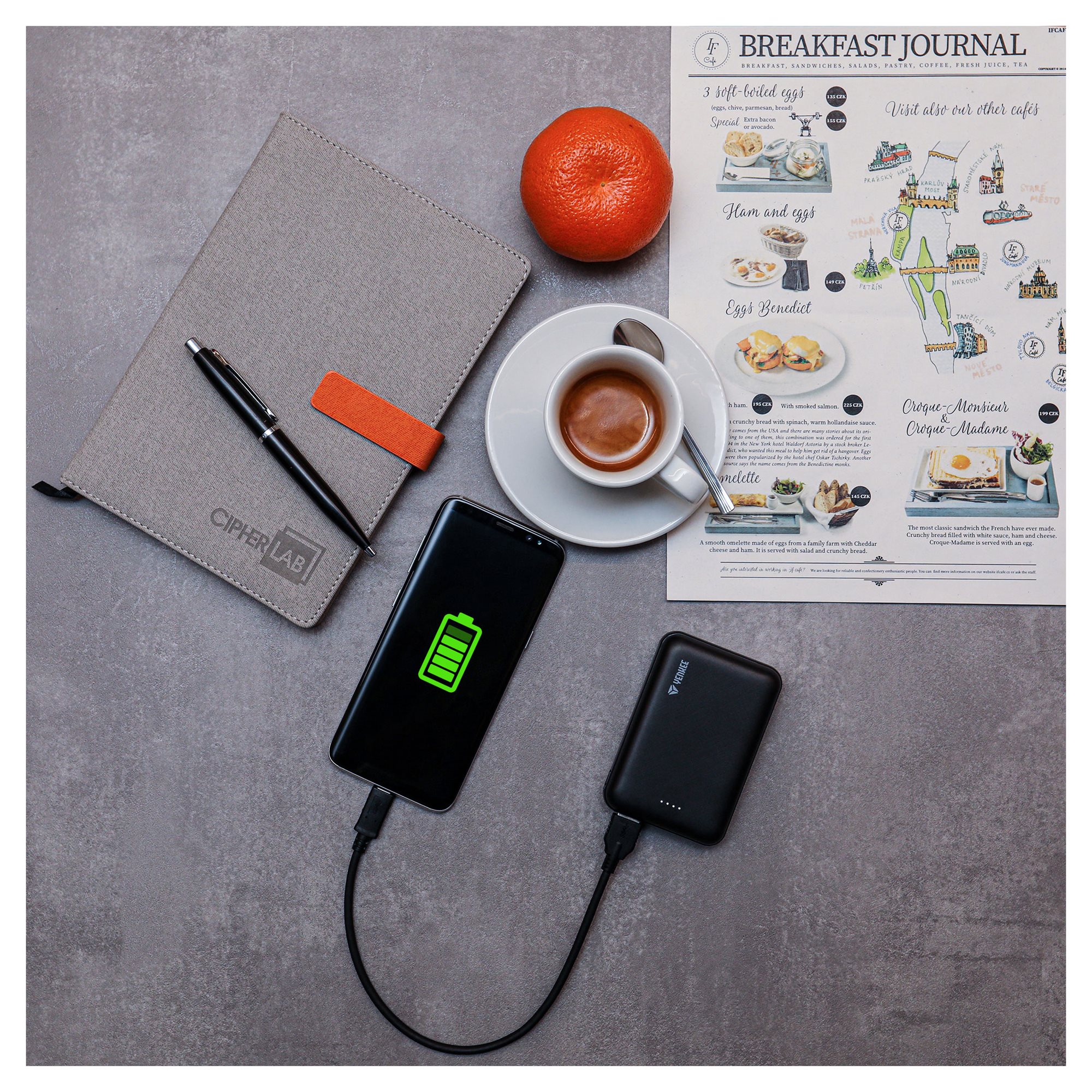 Miniatűr kompakt Powerbank, nagy kapacitással, akár 10 000 mAh-ig, és kettős USB-kimenettel, 2,1 A maximális töltési árammal. Kompakt méretei miatt ragyogó megoldás az utazáshoz.