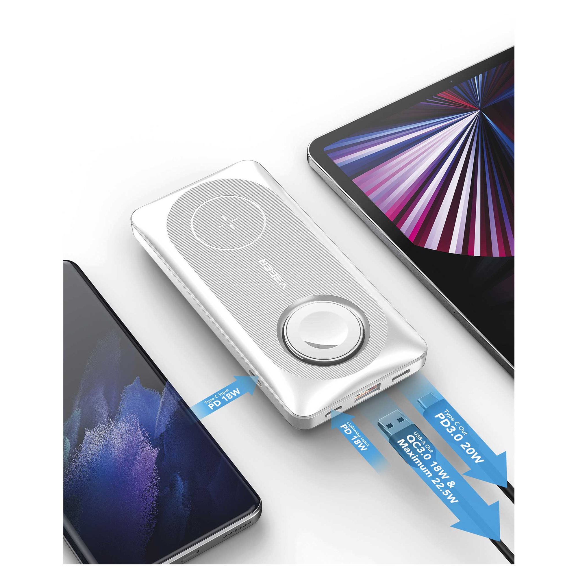 A YENKEE YPB 510 egyszerre akár három eszközt is feltölthet. USB A esetén akár 22,5 W, USB C porton 7,5 W, Apple Watch flip töltőn pedig 2,5 W teljesítmény biztosított. Vezeték nélküli töltés esetén pedig akár 15 W a MagSafe technológia segítségével, amely a telefonodat középre helyezi, biztosítva ezzel a hatékony töltést.