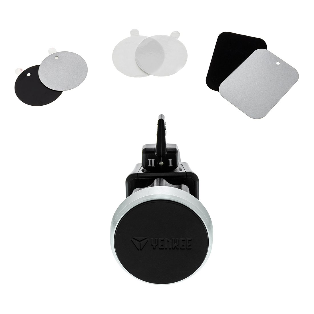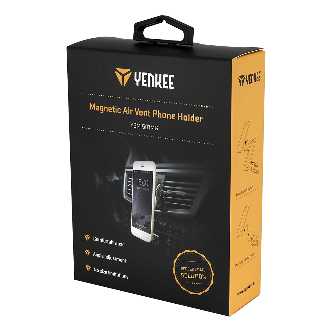 A YENKEE YSM 501MG egy szellőzőnyílásba helyezhető mágneses telefontartó, amely 360°-ban elforgatható és állítható látószöget biztosít, így mindig a lehető legjobb kijelző-megjelenítést nyújtja. Kompakt méretének és egyszerű telepítésének köszönhetően tökéletes megoldás az autóba, legyen szó navigációról vagy hívásfogadásról.