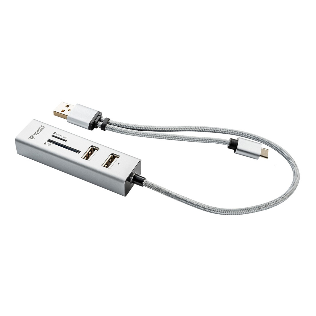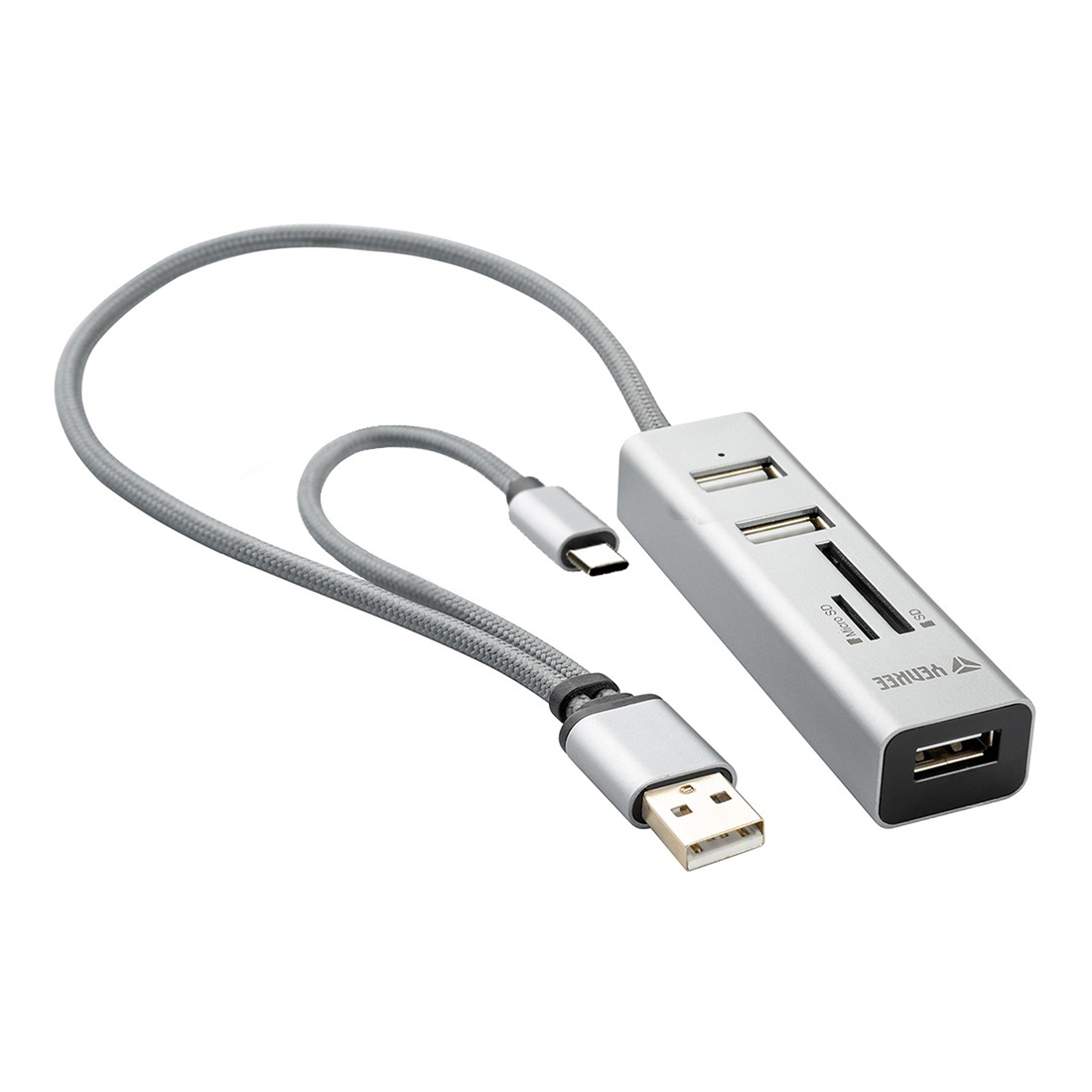 Elosztót és kártyaolvasót kombináló stílusos USB 2.0 adapter kiegészítve egy USB C OTG csatlakozással mobilkészülékekhez.