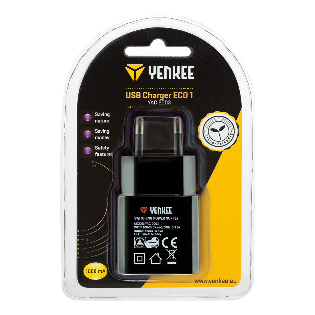 A Yenkee YAC-2003BK hálózati töltő egy USB aljzattal lett felszerelve, amely 1,0 Amperes töltésre képes. Minden magyarországi fali aljzattal kompatibilis, és szinte minden USB 2.0 csatlakozóval rendelkező kábellel használható legyen. A töltő megfelel a szigorú szabványoknak és többszörös védelemmel rendelkezik túlmelegedés, kigyulladás, rövidzárlat vagy túlterhelés ellen.