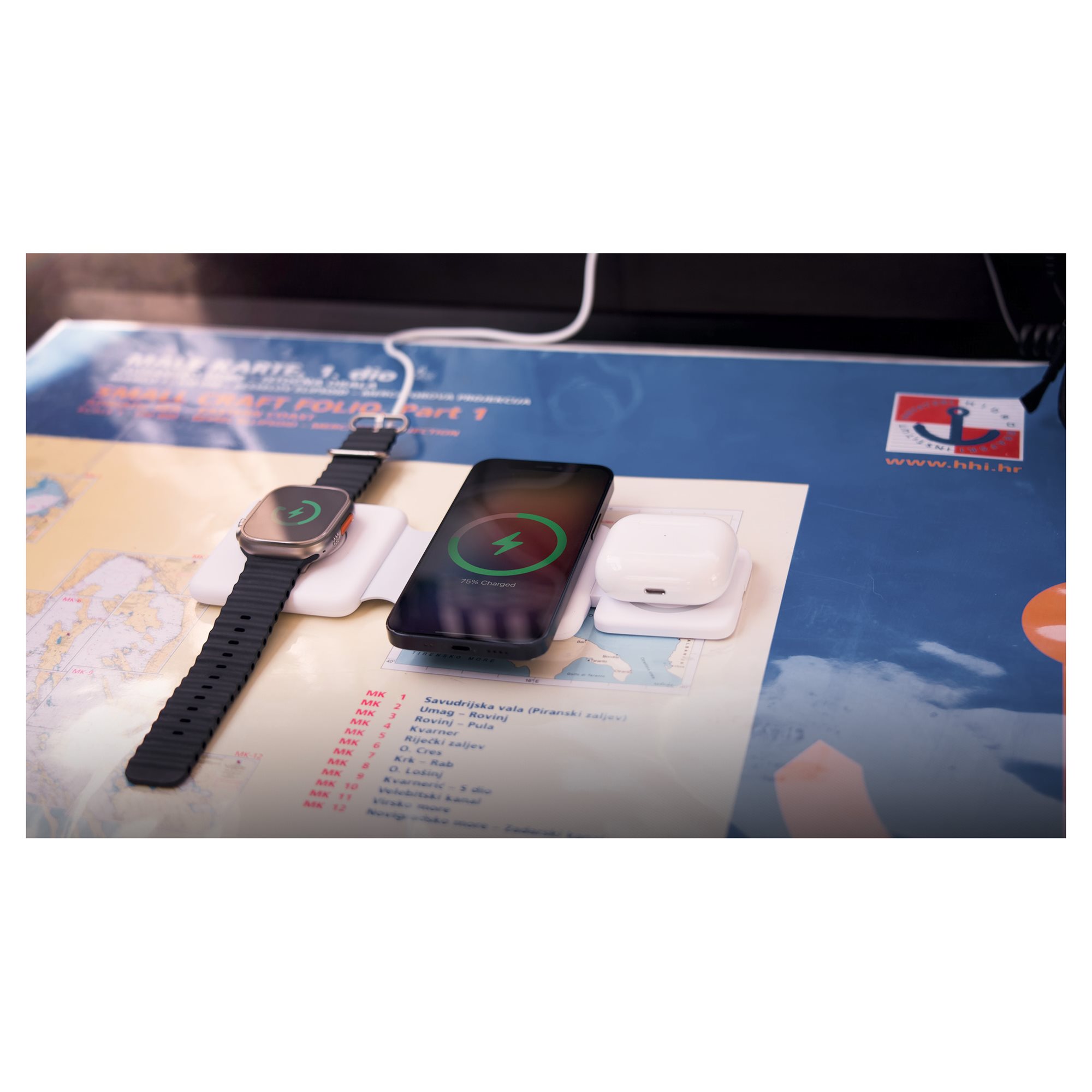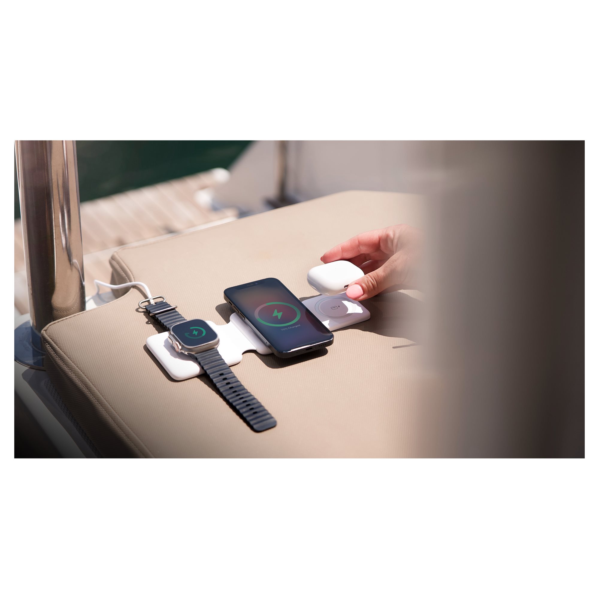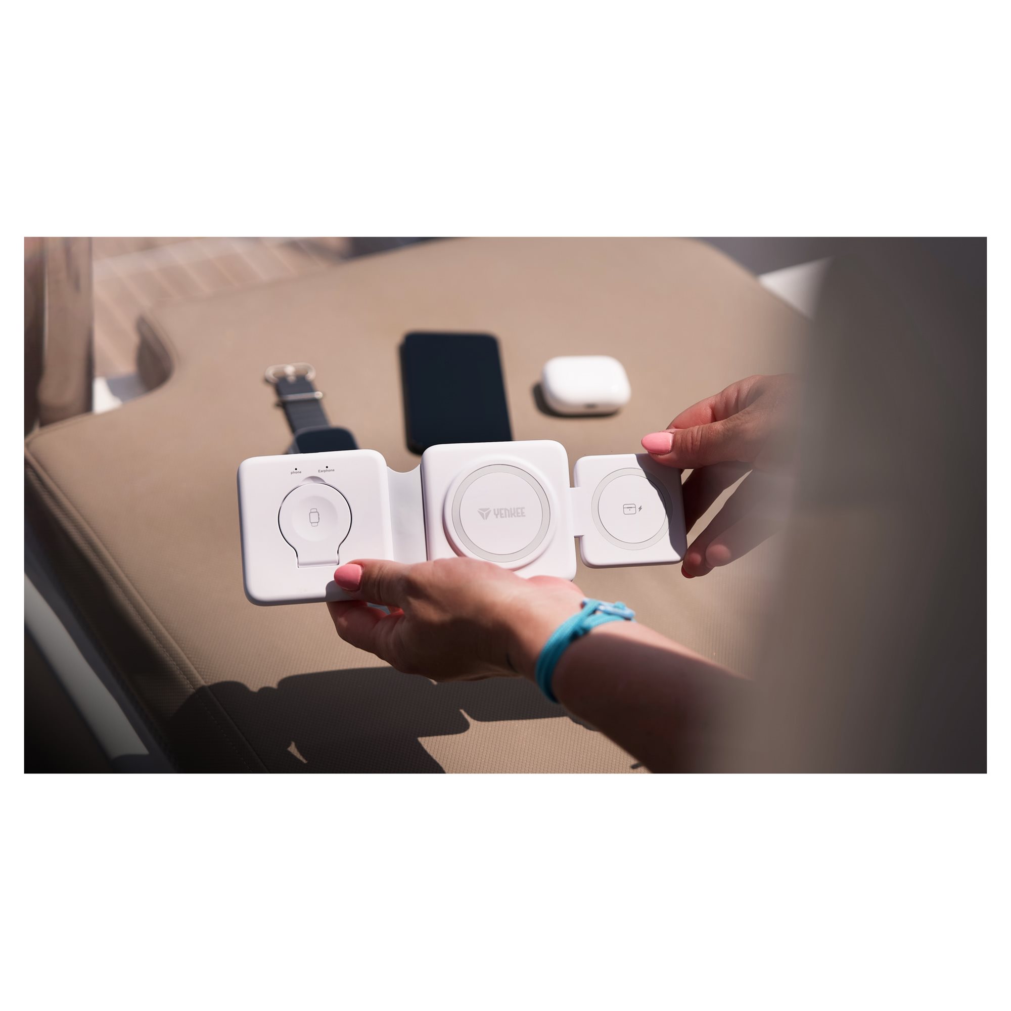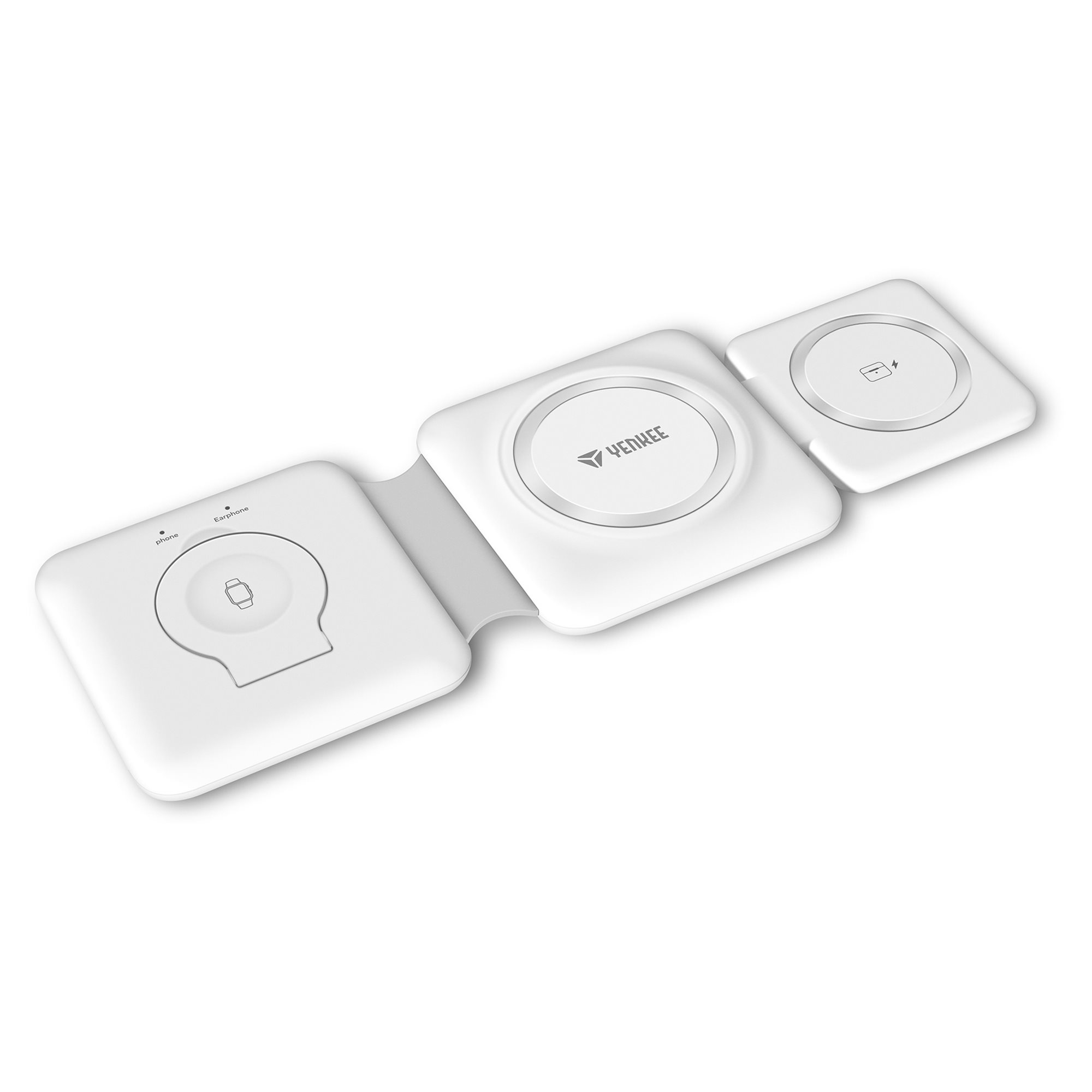 Amint az Apple készülékét a kijelölt töltőfelületre helyezi, az egy beépített mágnes segítségével rögzül, és automatikusan megkezdődik a töltés. Minden felületnek az ideális töltési teljesítmény áll rendelkezésre. A két LED-nek köszönhetően maga is ellenőrizheti az előrehaladást. Az egyes felületek között rugalmas szilikon csatlakozók találhatók, amelyek lehetővé teszik, hogy a YENKEE YAC 5330 3 az 1-ben utazó töltő nagyon kompakt formára hajtható legyen, így kényelmesen elfér egy nadrág- vagy kabátzsebben, táskában vagy táskában.