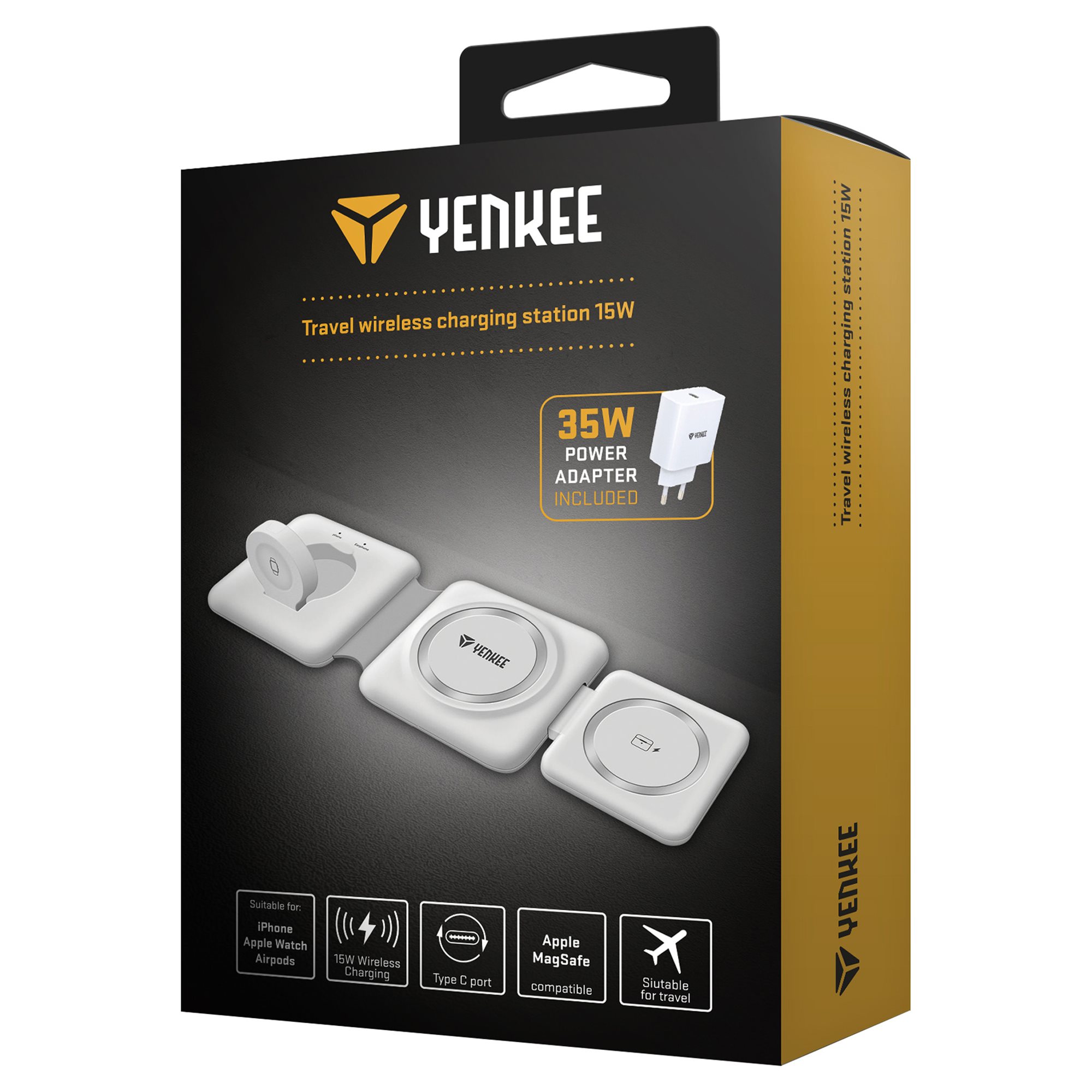 A YENKEE YAC 5330 3 az 1-ben utazási töltő biztonságos, MagSafe-kompatibilis vezeték nélküli töltést biztosít az Apple iPhone 12 és újabb készülékek számára. A töltés képes kikapcsolni magát abban az esetben, ha túlmelegedés vagy a készülék sérülése fenyeget, vagy ha egy váratlan akadály - például egy nem megfelelő mobiltelefon-borítás - akadályozza a töltést. A töltő megfelelő működéséhez legalább 24 W-os hálózati csatlakozásra van szükség. 35 W-os hálózati adaptert mellékelünk, amelyhez 1 méteres kábelt is mellékelünk.