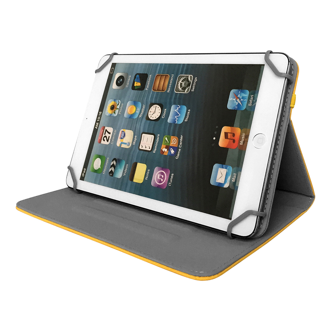 Univerzális védőtok állvánnyal 7” táblagéphez. A rögzítés a sarkokban és a rugalmas szalaggal történ bezárás biztonságos hordást tesz éehetővé, és megakadályozza, hogy a táblagép kiessen a tokból. A fiinom mikroszövet bélés optimális védelmet nyújt a karcolódás ellen.