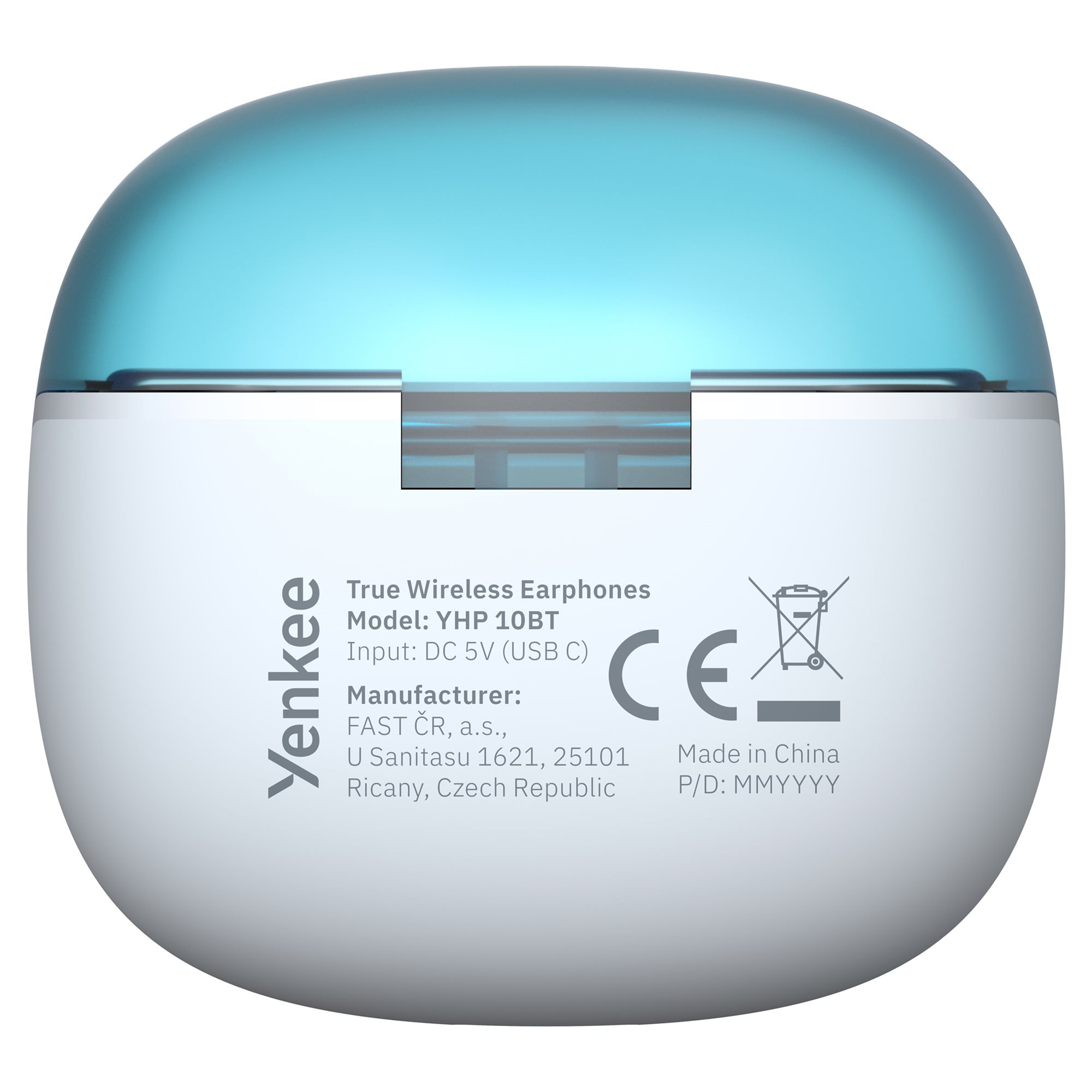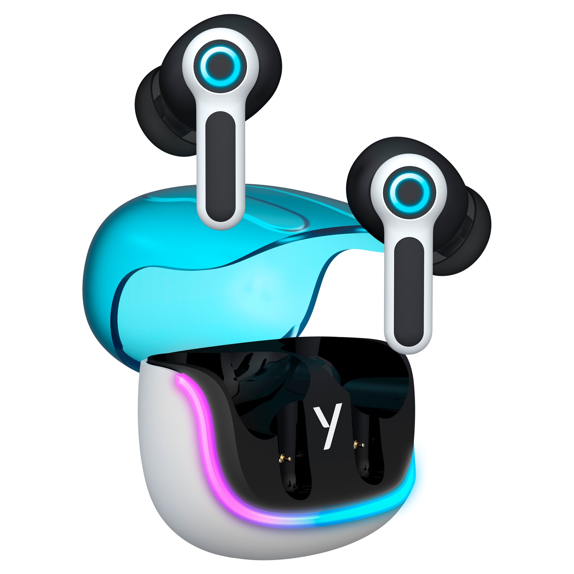 A fehér tok kék nyitással és fekete kiegészítőkkel modern és kifinomult megjelenést kölcsönöz. A tok színes világítása és a fülhallgatók kék kör alakú megvilágítása futurisztikus jelleget ad, ami kihangsúlyozza stílusos kialakításukat és egyedi karaktert ad nekik.